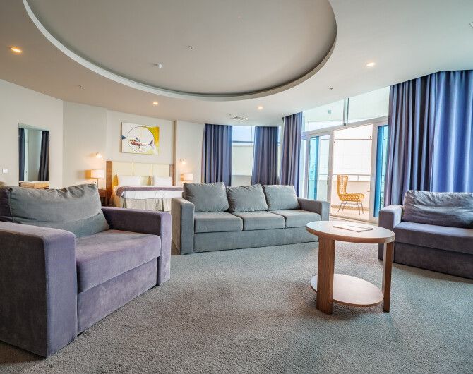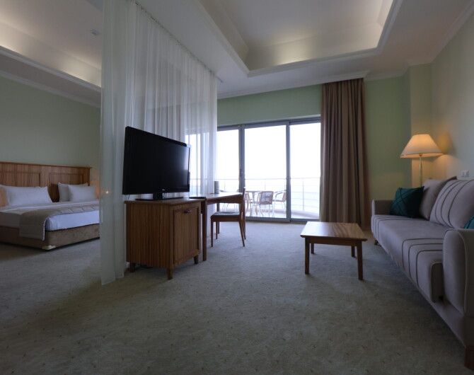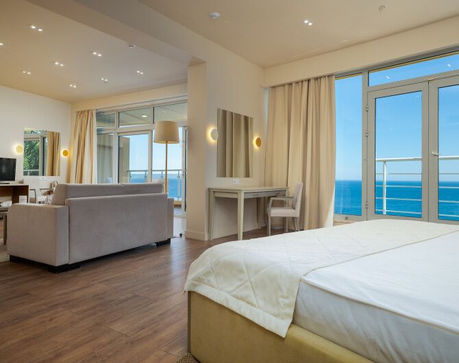 Двухкомнатный номер общей площадью 82м². Вид из окна — на море. Номер без балкона. Ванная комната с душевой кабиной. В номере двуспальная кровать. Доп место кровать или диван.