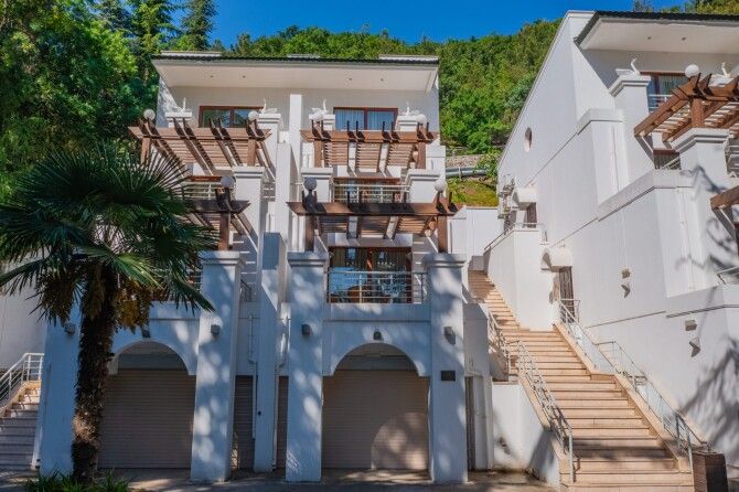 Гостевая 4хэтажная вилла расположена в глубине парка, вдали от шума и суеты. Помещения виллы оформлены в классическом стиле, ее просторные апартаменты подойдут истинным ценителям роскоши. В цокольном этаже — мини-SPA-центр (бассейн под меняющим цвет куполом «звездное небо», хамам, римская баня, сауны, джакузи). На первом этаже находится гостевая комната с камином и выходом на террасу, банкетный зал, кухня. Вилла сдается целиком. Удаленность от моря – 420 м.