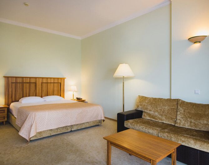 Двухкомнатный номер общей площадью 27 м². Вид из окна — на парковую территорию. Номер с французским балконом. Санузел с ванной. В номере одна двуспальная кровать. Доп место — диван.