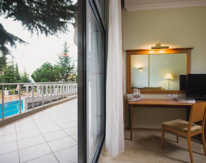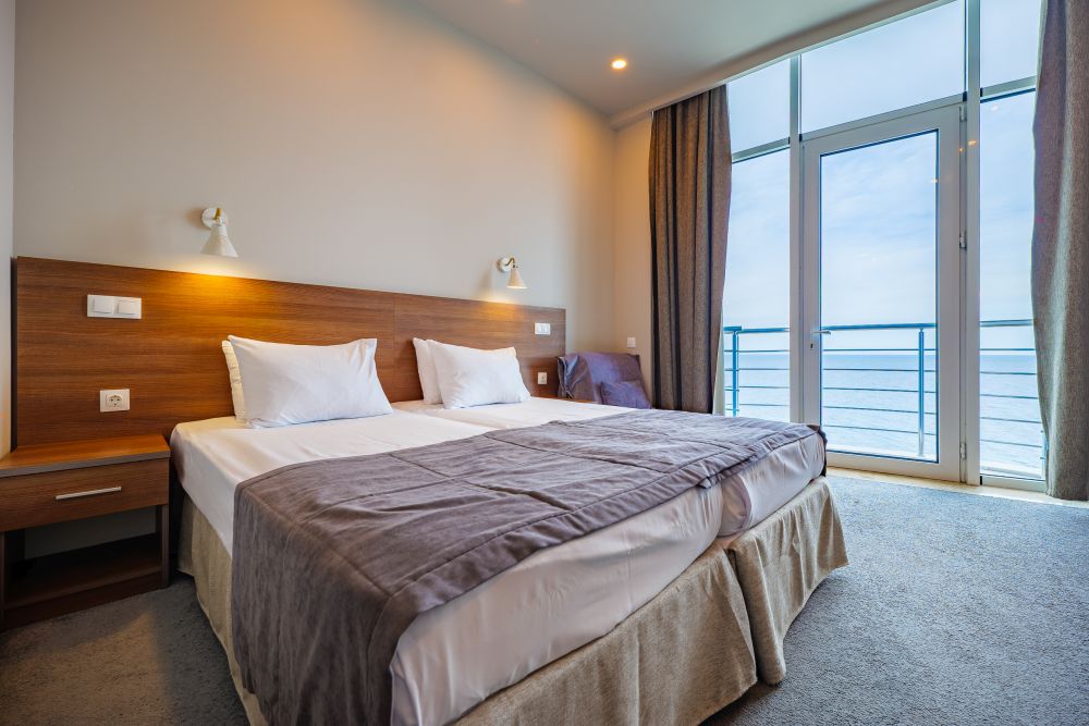 Однокомнатный номер общей площадью 30 м². Вид из окна — на море. Номер с балконом или с французским балконом. Ванная комната с душем. В номере одна двуспальная кровать. Доп место устанавливается не во всех номерах.