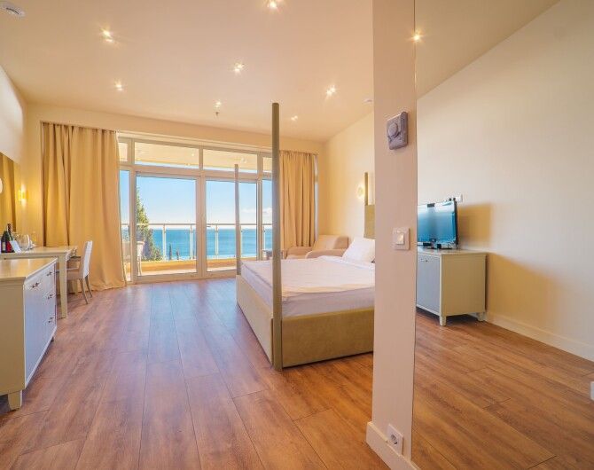 Однокомнатный номер общей площадью 70 м² (Спа-корпус) или 100 м² (SEA GARDEN). Номер условно разделен на две зоны: гостиную и спальную. Ванная комната с ванной или душевой кабиной. Номер с большой террасой и видом на море. В номере одна двуспальная кровать. Доп место — диван.