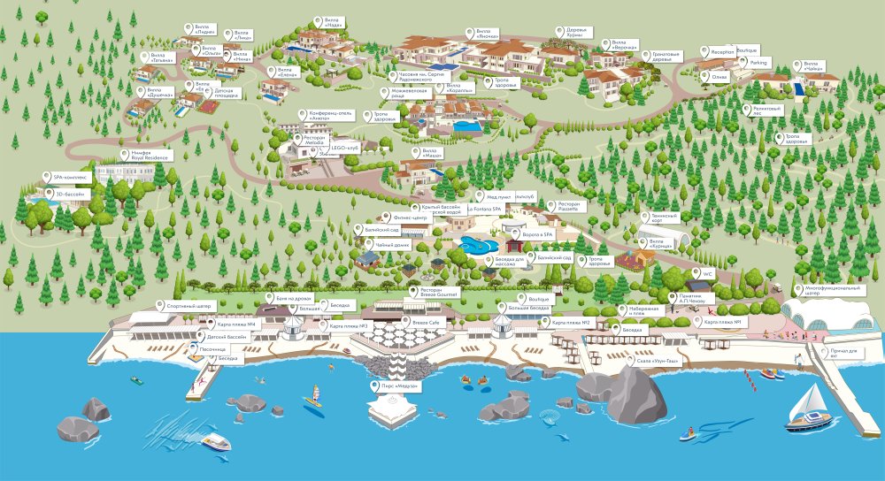 — «Деревня» – это рекреационный центр, где к услугам гостей представлены ресторан «Piazzetta», La Fontana SPA, солнечные террасы, бассейны, бары, фитнес-центр.
