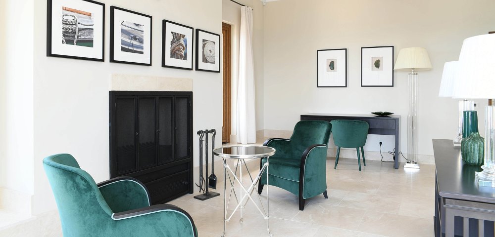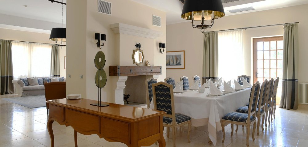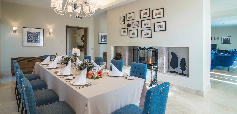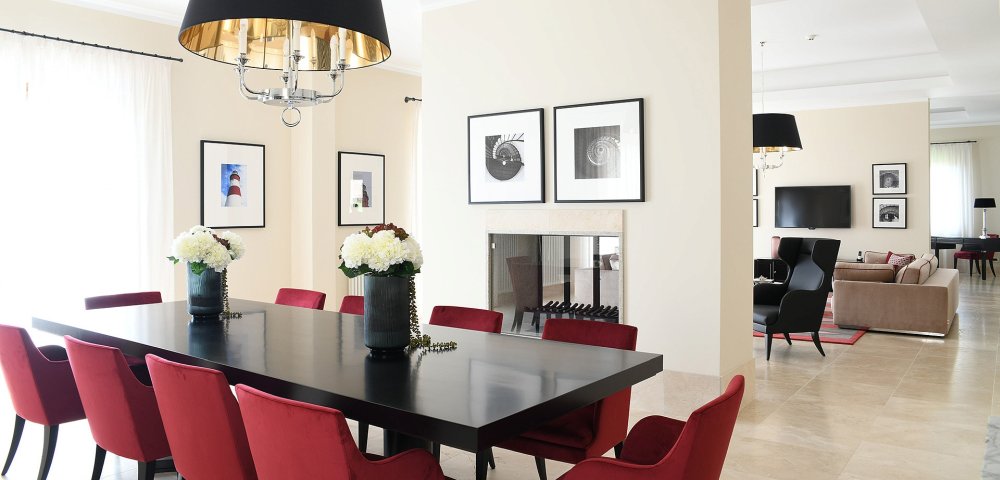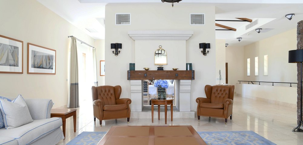 На одном этаже располагается большая гостиная, кухня и столовая на 10 посадочных мест. Из огромных панорамных окон гостиной открывается завораживающий вид на море. Камин, в окружении мягких кресел и больших удобных диванов, дополняет изысканный дизайн виллы.