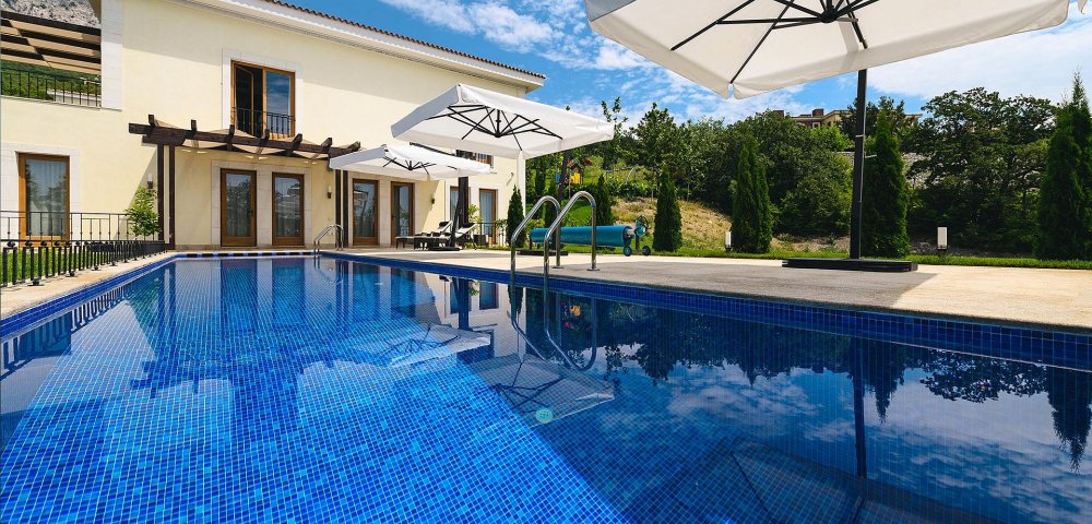 Любителям уединения и спокойствия предлагаем остановиться в просторной и комфортной 2-х этажной вилле «Надя» с собственной террасой, большой гостиной, открытым бассейном с морской водой, джакузи и баром. Великолепные пейзажи Черного моря и Крымских гор можно созерцать из окон номеров, красивой террасы или принимая солнечные ванны в открытом инфинити-бассейне и джакузи с морской водой.