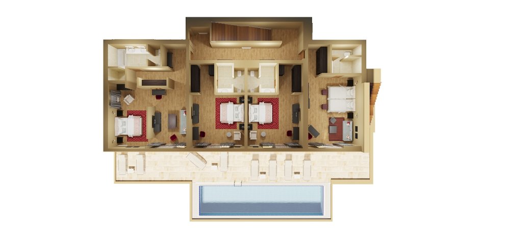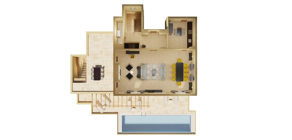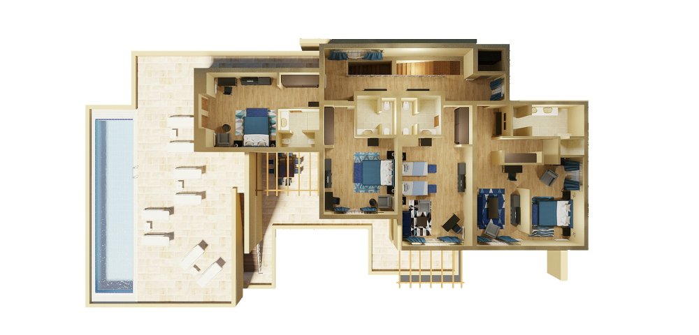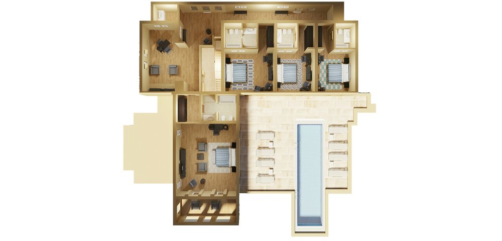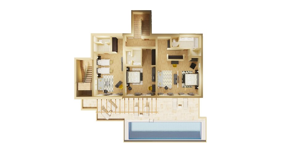 На верхнем этаже находится рабочий кабинет. Рядом с ним – основная спальня с кроватью размера king size и отдельной зоной для отдыха. Еще три гостевые спальни находятся в противоположном крыле виллы. Каждая спальня имеет отдельную ванную комнату и выход на верхнюю террасу к бассейну.