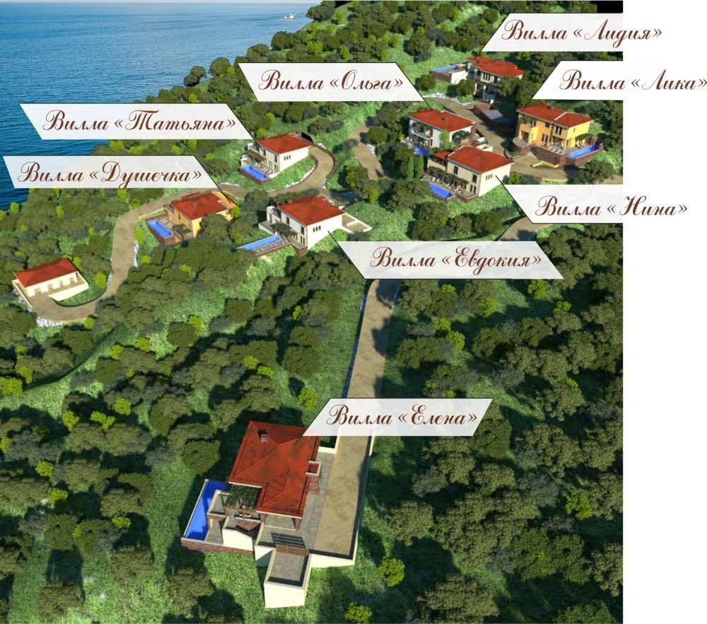 Виллы на 3 спальни: «Нина», «Душечка», «Лика», «Евдокия», «Елена», «Татьяна».