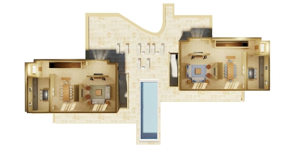 На каждой вилле расположены две просторные террасы. На одной из них – комфортабельная зона отдыха, которая отлично подойдет для семейных завтраков на открытом воздухе, на другой – панорамный бассейн с подогреваемой водой.