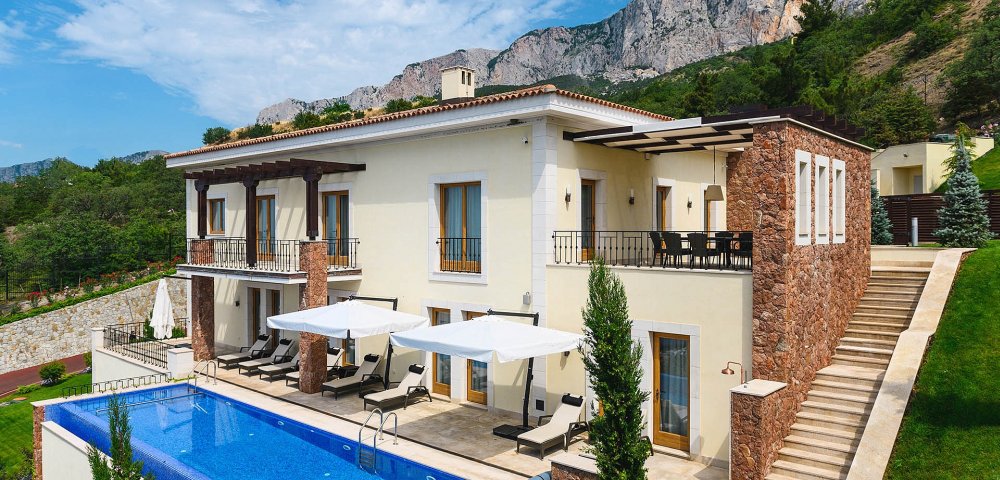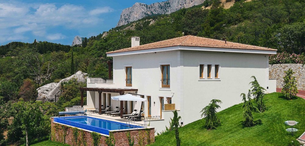 Отдыхая в светлой гостиной с камином, можно часами любоваться пейзажами ЮБК из огромных панорамных окон. На некоторых индивидуальных виллах предусмотрен личный кабинет. Каждая вилла оснащена системой климат-контроля и полами с подогревом. Практически всё: от отделочных материалов до штор и кухонного инвентаря- выполнено на заказ и привезено из Милана в Ялту.