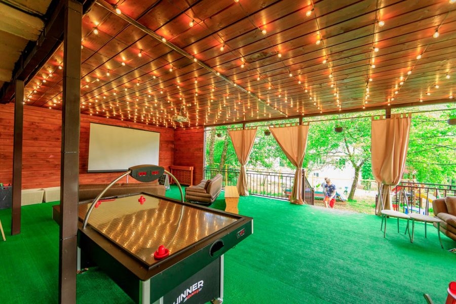 теннисный корт, волейбольная площадка, настольный теннис, аэрохоккей, дартс;
