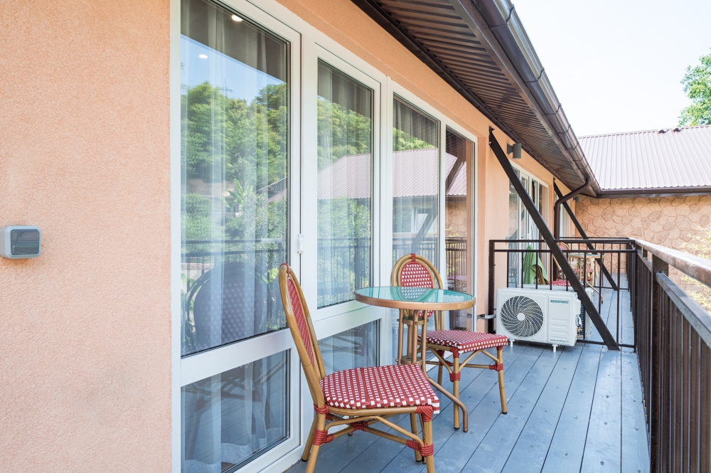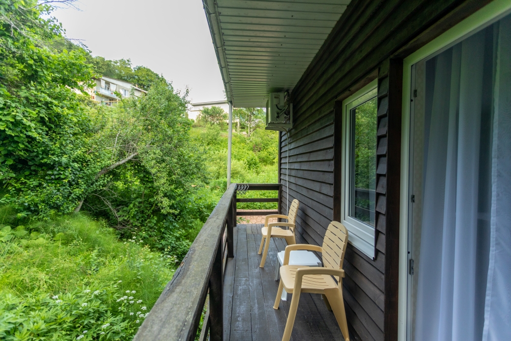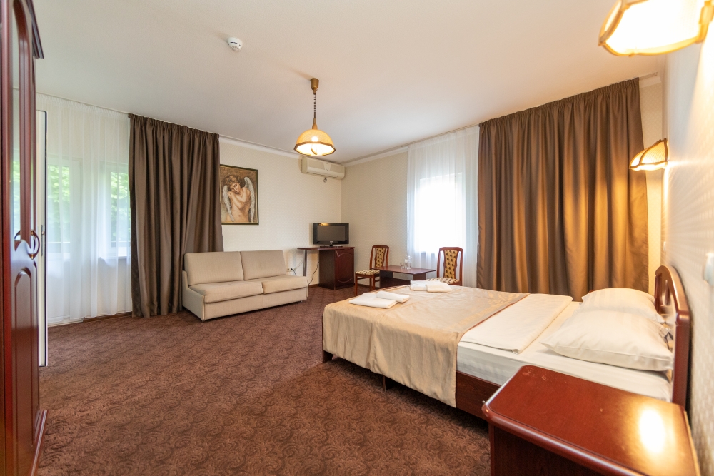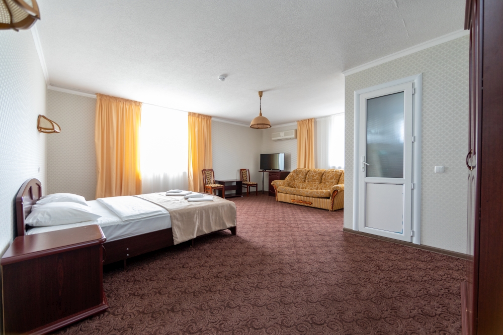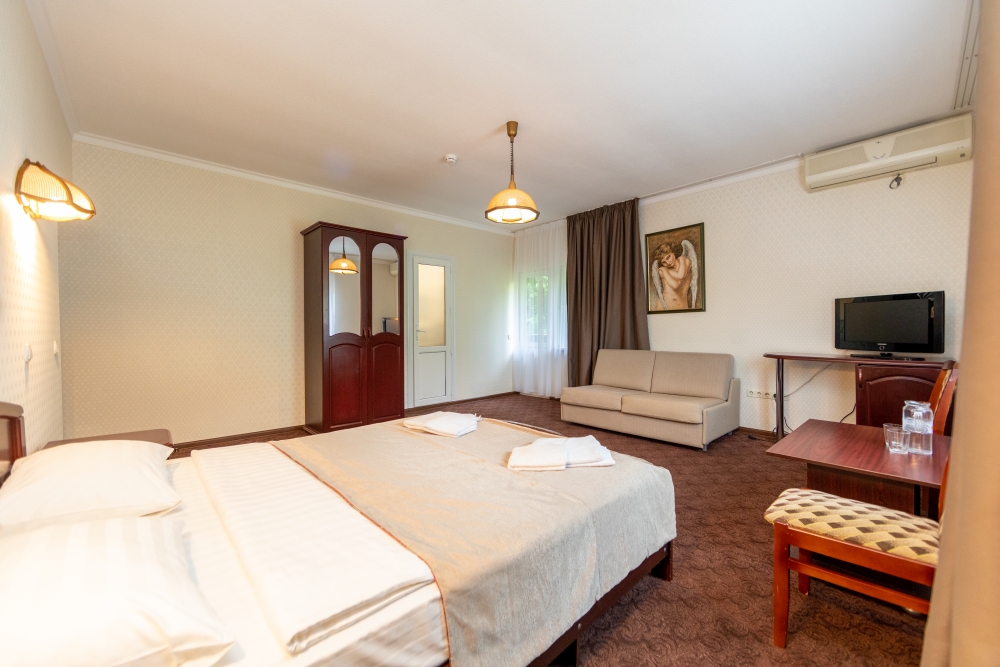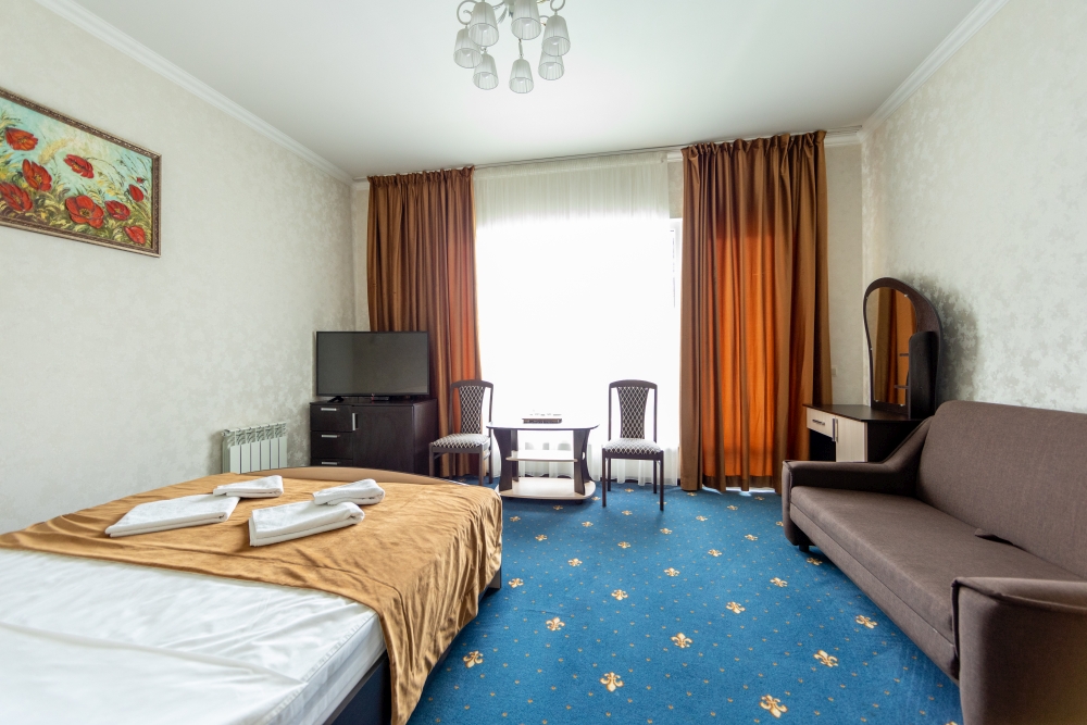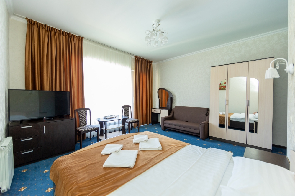 Отдельно стоящий корпус с обеденным залом столовой. Номера категории стандарт улучшенный с балконом, студия улучшенная с балконом, люкс Панорама.