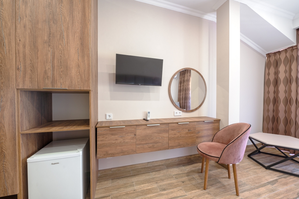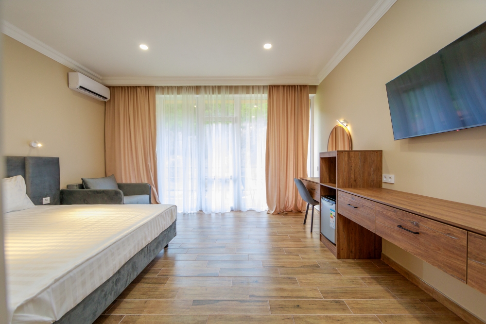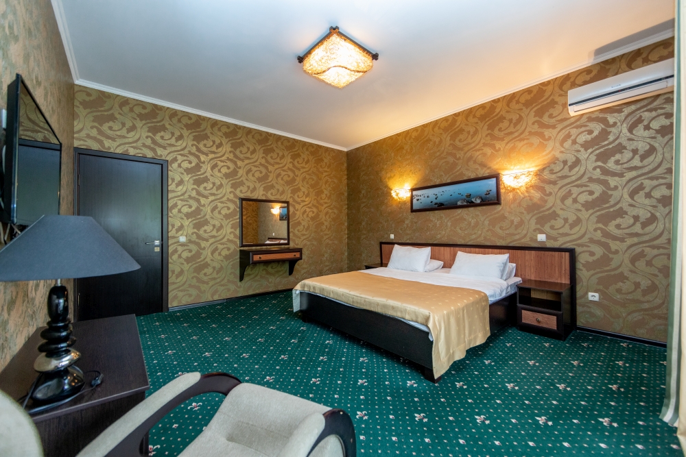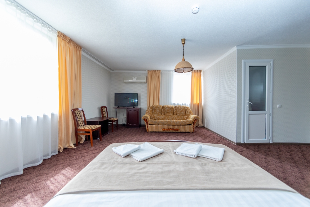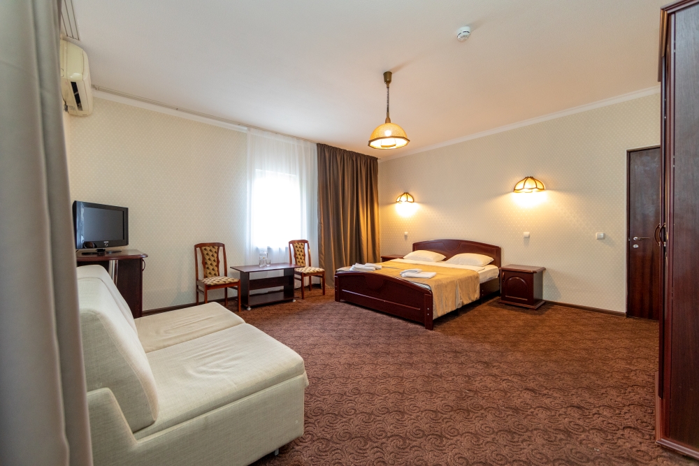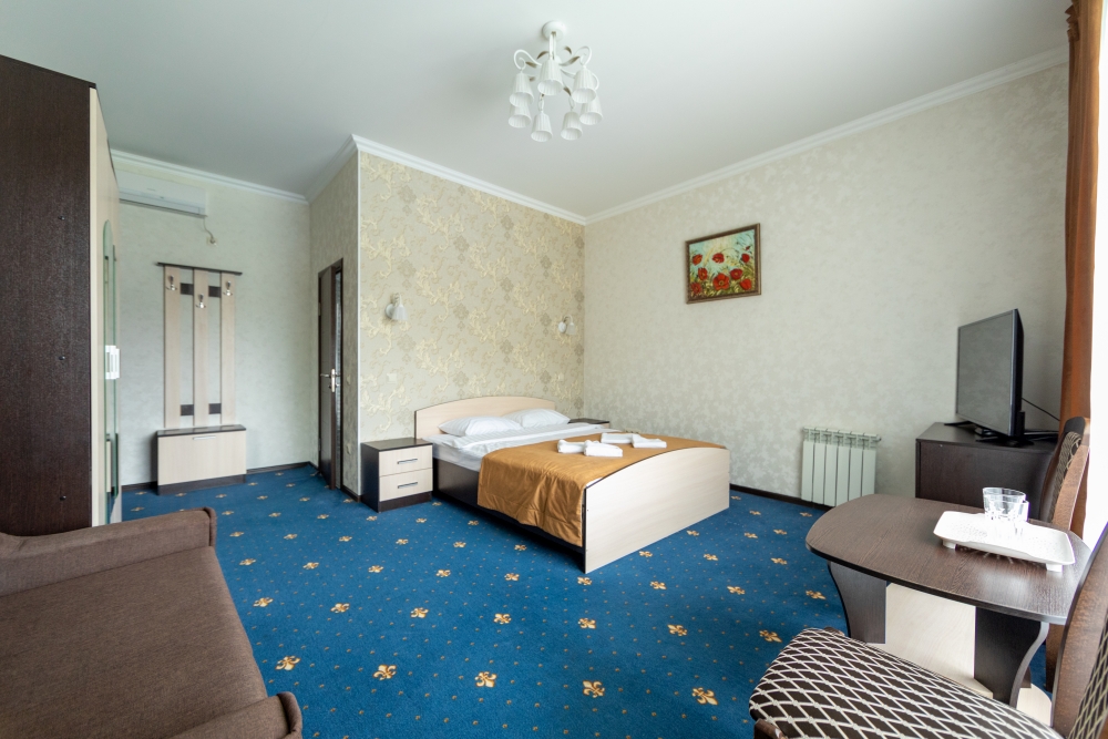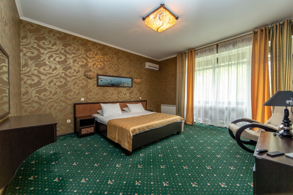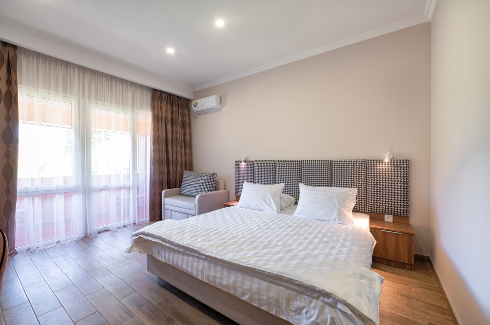 Отдельно стоящий корпус с обеденным залом столовой. Номера категории стандарт улучшенный с балконом, студия улучшенная с балконом, люкс Панорама.