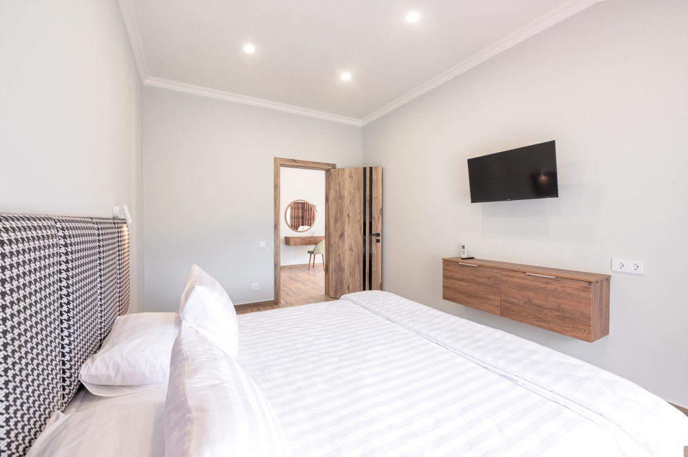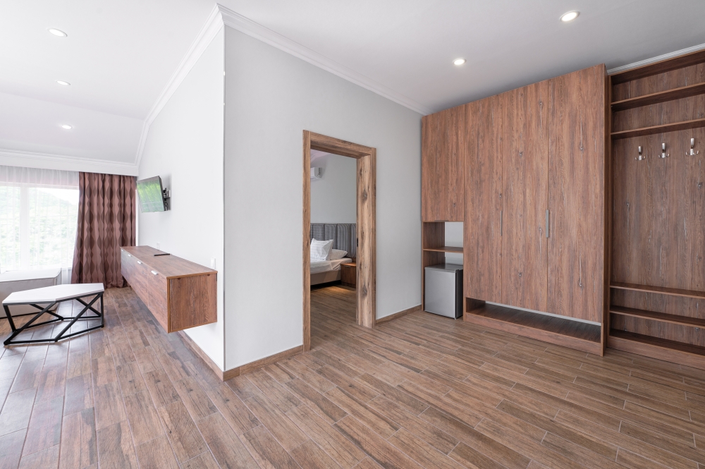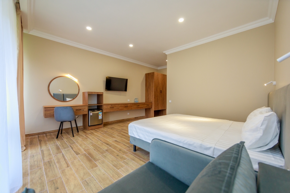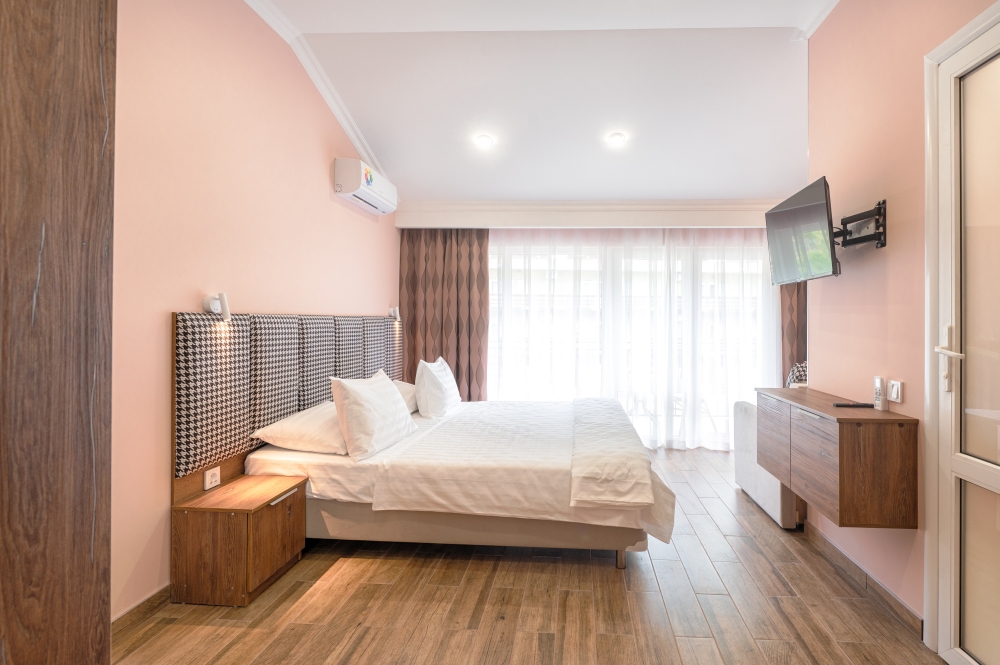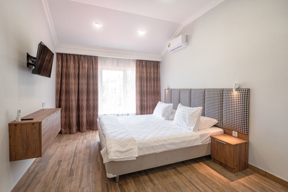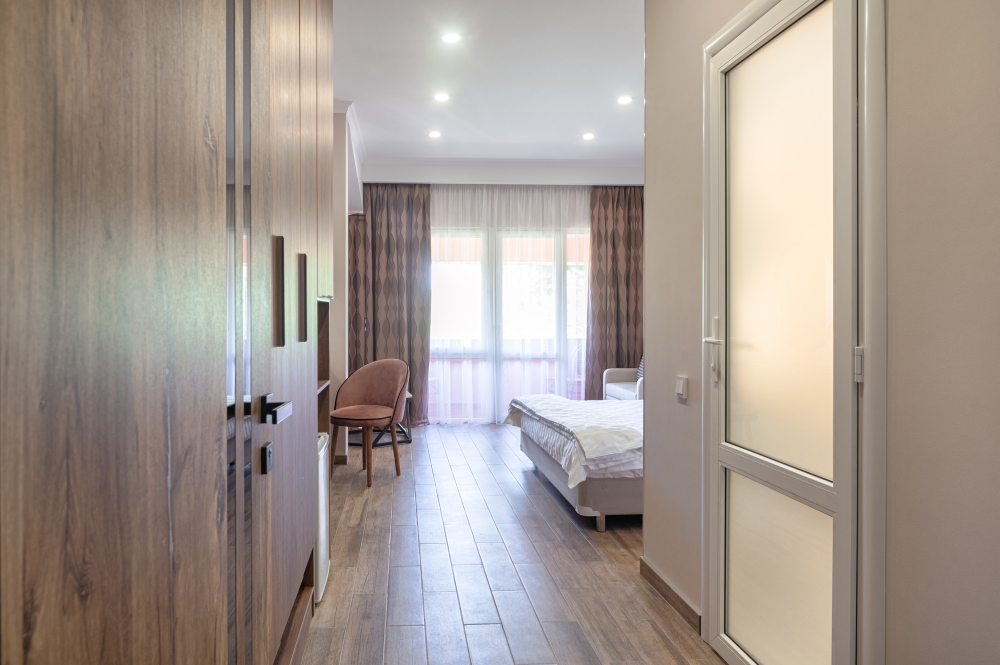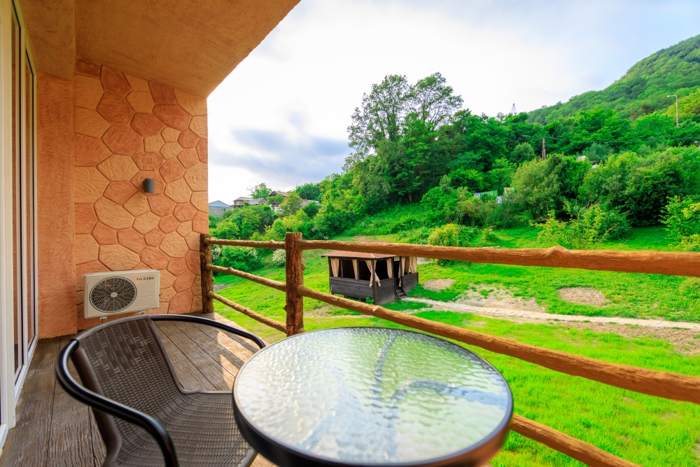 Отдельно стоящий корпус с обеденным залом столовой. Номера категории стандарт улучшенный с балконом, студия улучшенная с балконом, люкс Панорама.