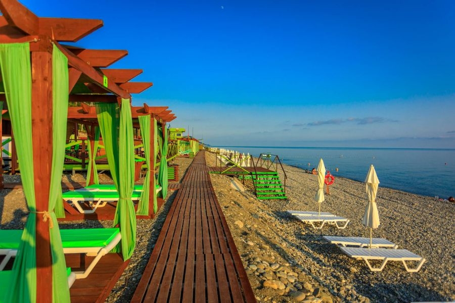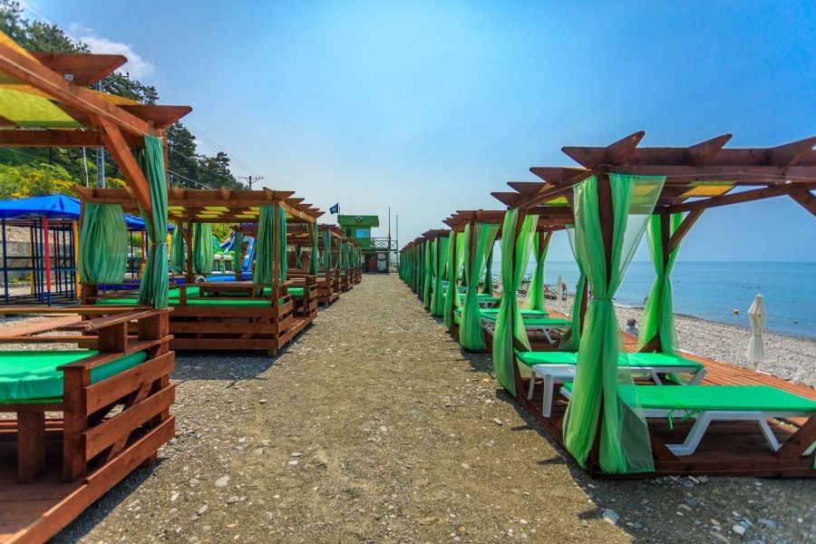 трансфер на оборудованный пляж «GreenBreeze» и услуги на пляже: шезлонги, теневые зоны, душ, туалет;
