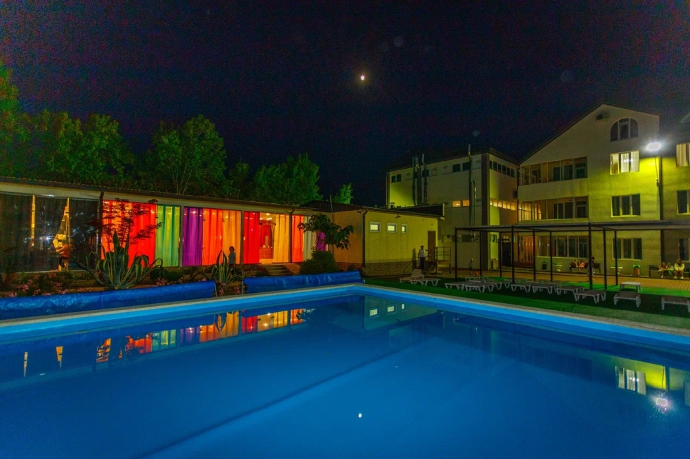 Открытый подогреваемый бассейн (площадь 150 м2, глубина 1,5 метра).