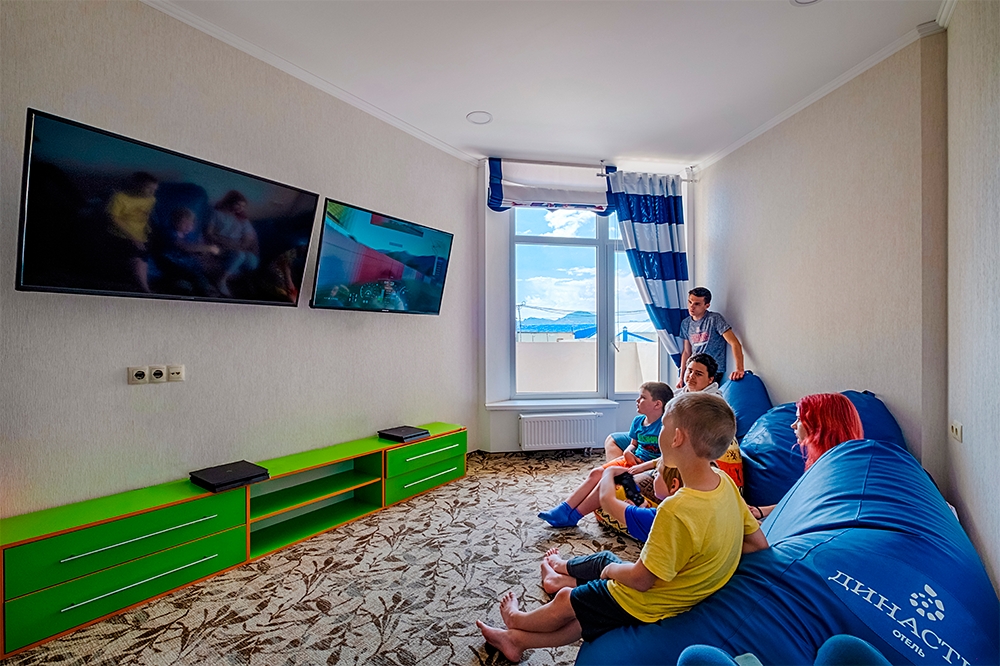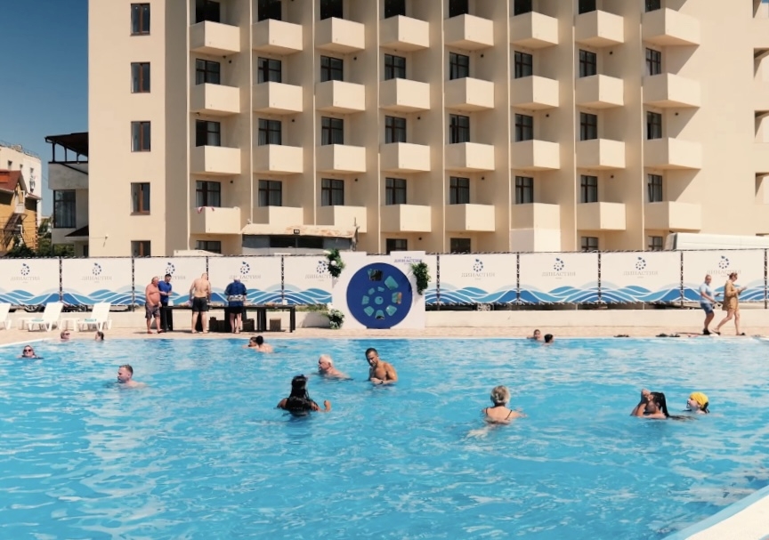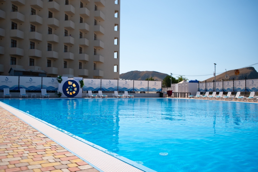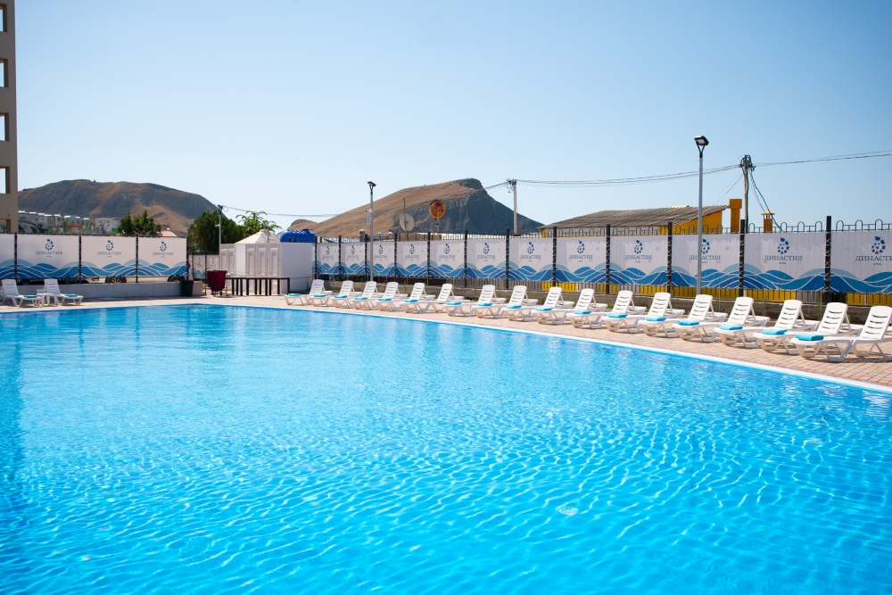 На первом этаже отеля “Династия” располагаются: пиццерия “Жар-Пицца”, продуктовый магазин, магазин “Крымская косметика”.