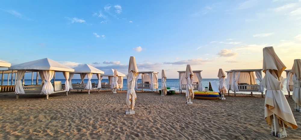 На пляж возит автобус, но не очень удобно когда ходишь на процедуры. Не успеваешь на него. Поэтому ходили на городской пляж. Согласен с предыдущим отзывом, что можно загорать в любом месте . Были даже в центре города на пляже, но там плиты… это не всем наверное подойдет. Питание -для нас было больше чем предостаточно!! На завтрак кашу сам бери, никто не смотрел сколько я налью и еще 1 блюдо заказное приносили официанты . Чай наливали сами . Было кофе -но мы такое не пьем. В номере у нас было свое …