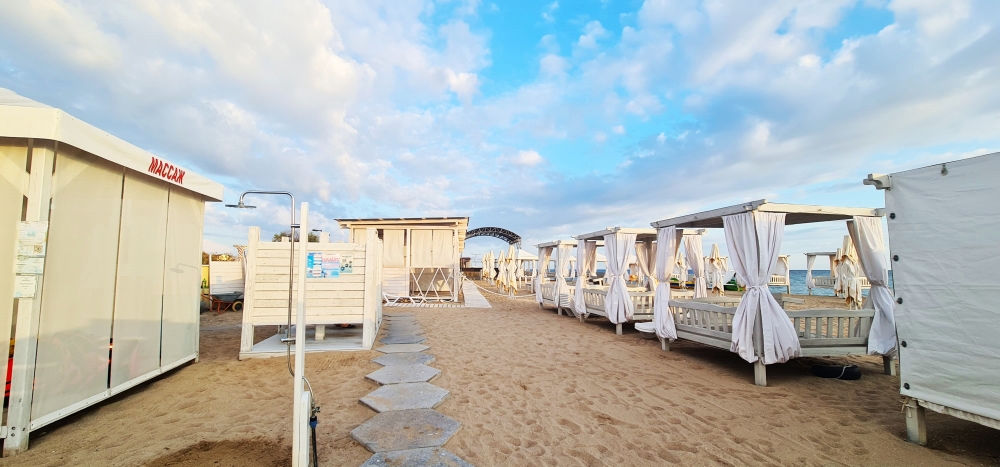 в 800 м от санатория 2 карты пляжа , песчаные, благоустроенные(оборудованы лежаками, теневыми навесами, летними душевыми кабинками, питьевыми фонтанчиками, туалетами, медицинскими пунктами, барами). Доставка на пляж автобусами.