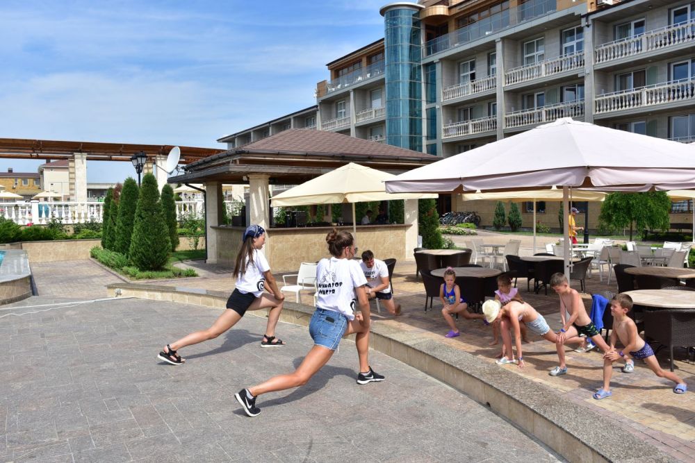 Безопасная площадка с мягким покрытием для игр в волейбол, баскетбол, мини-футбол, теннис и любые подвижные игры. Плавательный крытый бассейн 25м и развлекательный открытый бассейн для водных видов спорта. Анимация для взрослых и детей.