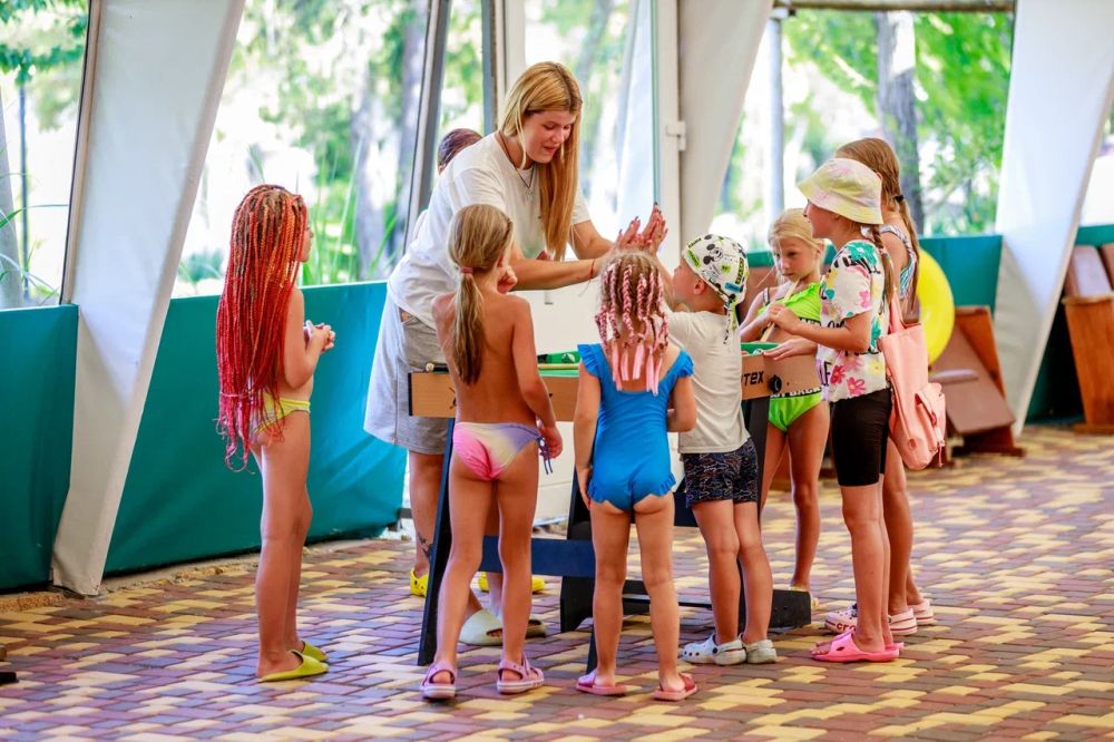 Детский мини-клуб (от 3-х до 12-ти лет) с воспитателем. В отдельном просторном здании находится детский клуб, где собрано большое количество разнообразных игрушек и развивающих игр. В детской комнате находится воспитатель, который под наблюдением родителей проведет с детьми увлекательные мастер-классы, развивающие игры, веселые игры с безопасными красочными модулями. Здесь в отдельном помещении оборудован кинозал с большим экраном и проектором. Для других культмассовых мероприятий есть летний шатёр (размеры 24 м. *12 м.)