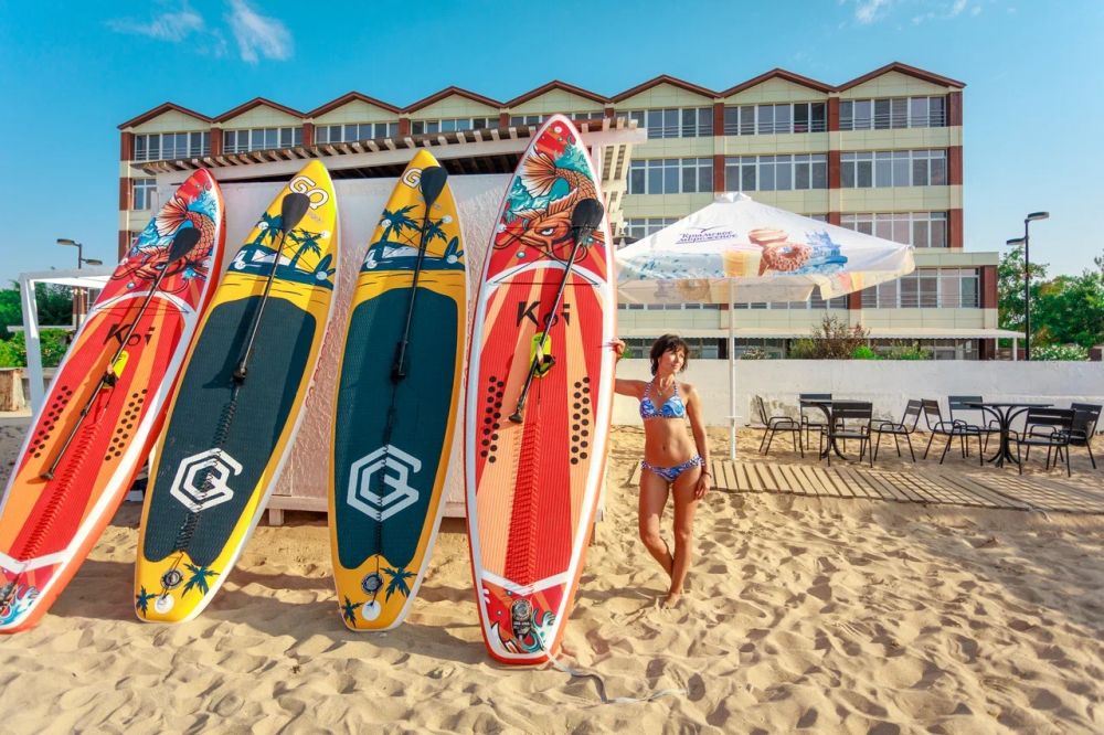 Пользование собственным песчаным пляжем, который находится в пешей доступности от отеля — в 200 метрах, оборудован всем необходимым для пляжного отдыха: теневые навесы, шезлонги, душевые, туалеты, пост спасателя и медицинский пост. Стоит отметить, что безопасный пологий вход в море особенно актуален для пляжного отдыха с детьми.