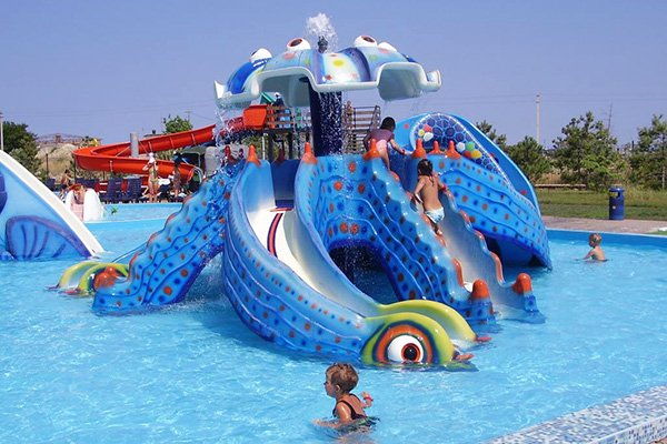 батут, детское отделение в крытом и открытом бассейнах, игровая комната с воспитателем, игровая площадка.