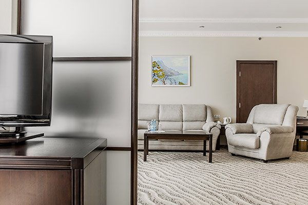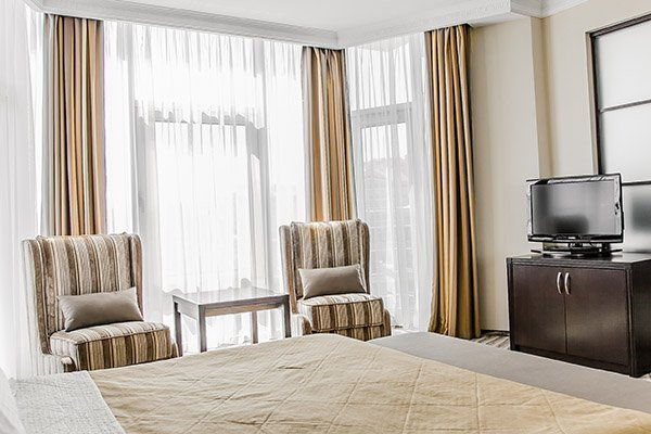 Двухкомнатный Люкс Для Вашего комфортного пребывания мы предлагаем Вам просторные номера категории Premier Suite площадью 71 м2 с прекрасным видом на город или море. Номера укомплектованы двуспальной кроватью king size (180*200 см), комфортабельным раскладным диваном и креслами. Двухместный диван может использоваться как дополнительное спальное место.